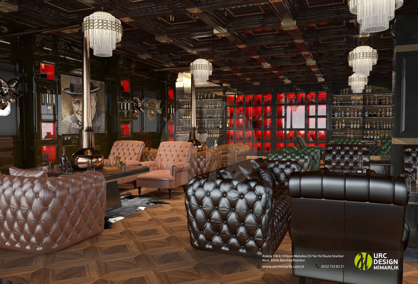 Ayrıca, iç mekan düzenlemesi, oturma gruplarının stratejik konumlandırılması ve yüksek kaliteli malzemelerin kullanımıyla konforu ön planda tutuyor. Bar alanındaki ahşap detaylar ve metal aksesuarlar, modern bir endüstriyel dokunuş eklerken, geniş ve ferah mekan düzeni, konukların rahatça dolaşmasını sağlıyor. Whiskey Lounge'un iç mekan tasarımı, konuklarına unutulmaz bir atmosferde, kaliteli zaman geçirme imkanı sunarak, keyifli anılar biriktirmelerine olanak tanıyor.